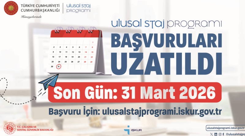 Cumhurbaşkanlığı Himayelerinde Türkiye İş Kurumu (İŞKUR) koordinasyonunda 2026 yılı “Ulusal Staj Programı” öğrenci başvuruları 06 Ocak 2026 tarihinde başlamış olup 31 Mart 2026 tarihi saat 23:59’a kadar devam edecektir.
